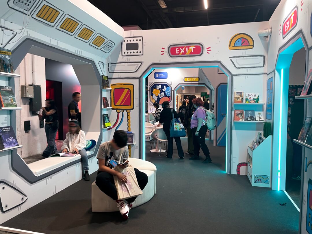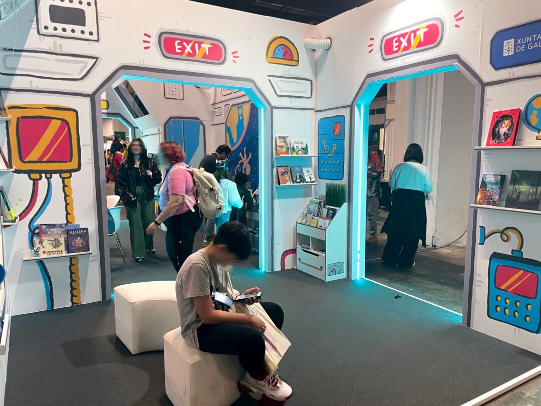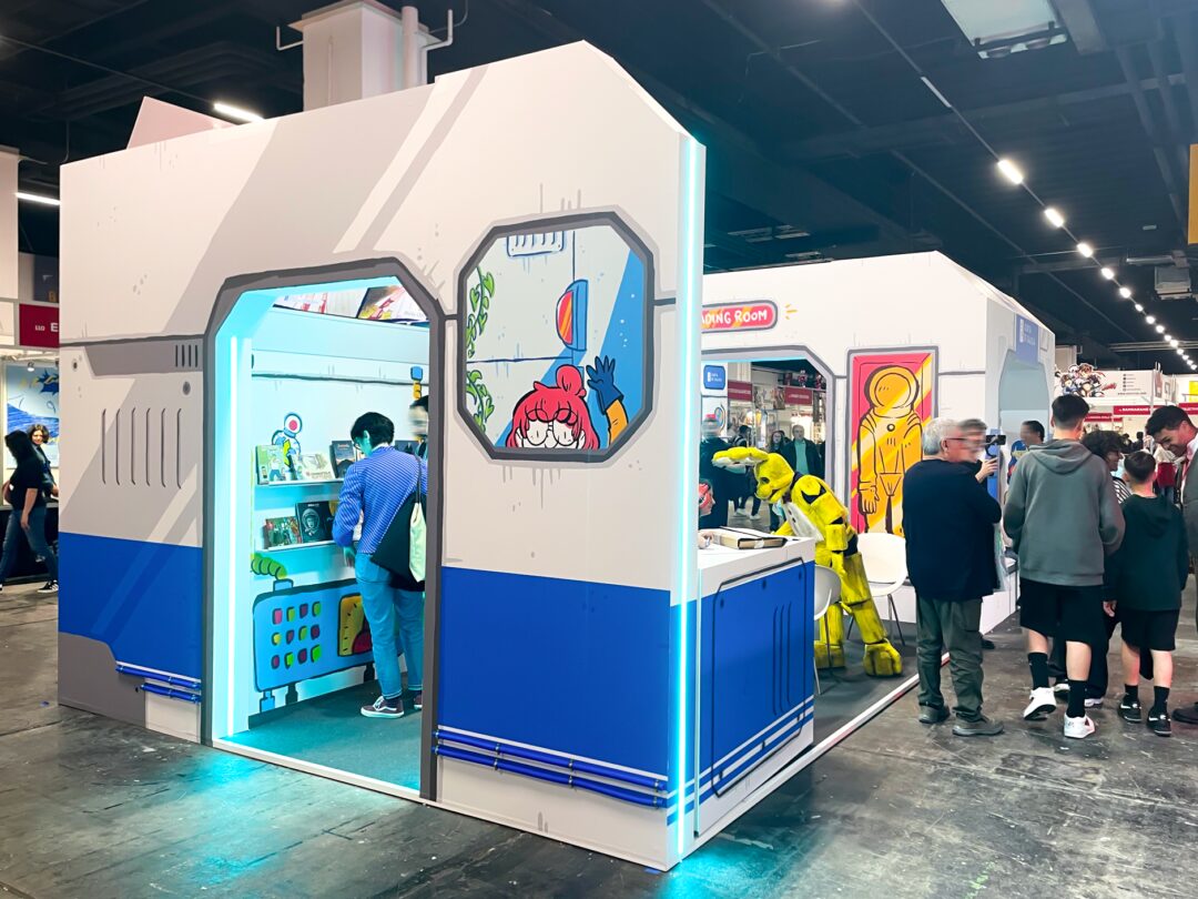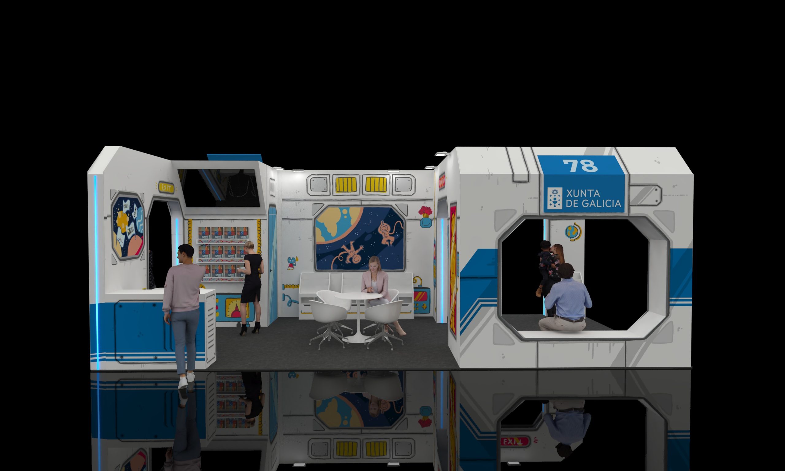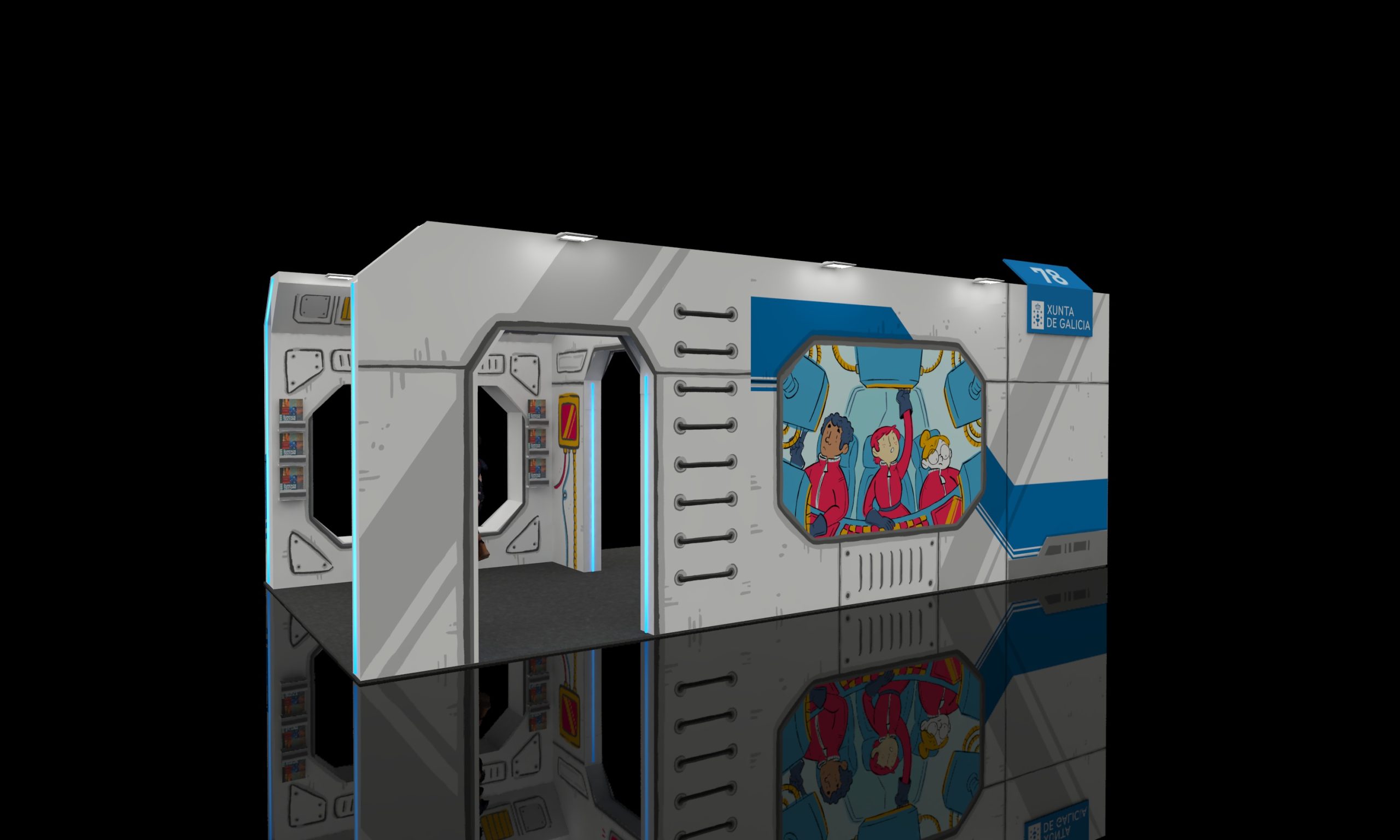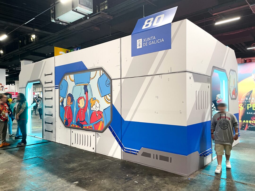 Ilustraciones para el decorado exterior e interior del stand oficial de la Xunta de Galicia en el Cómic Barcelona 2025, simulando una nave espacial.