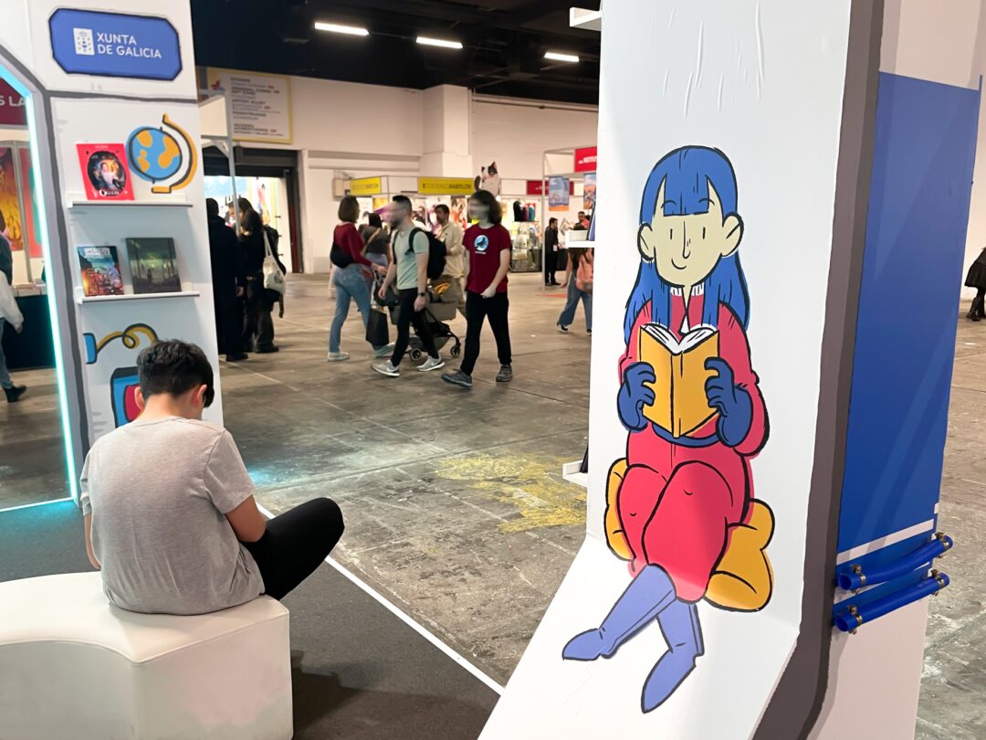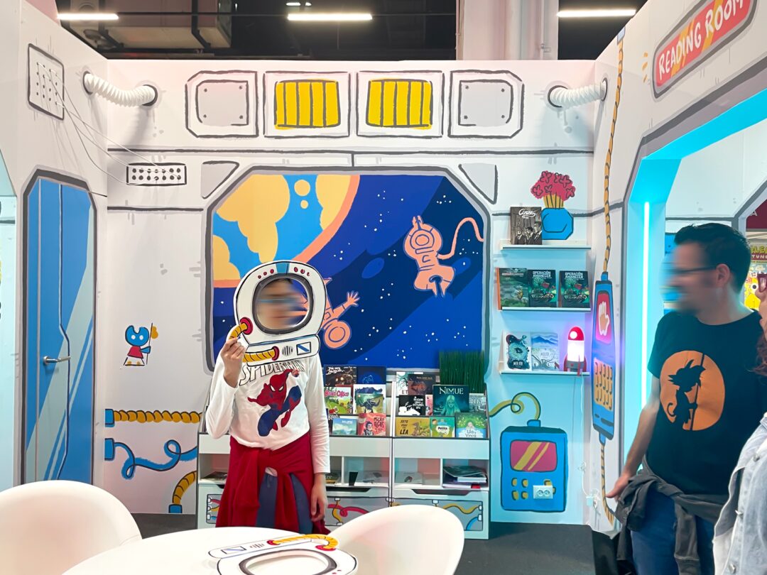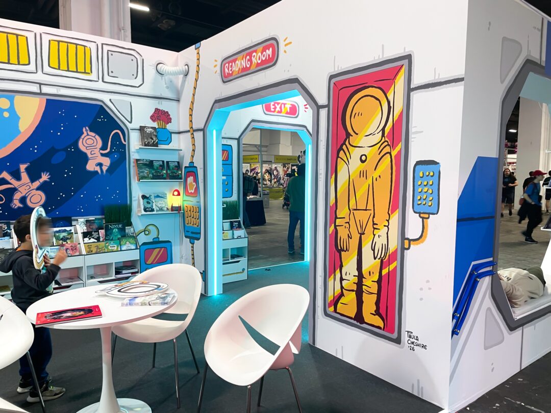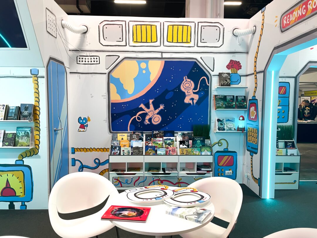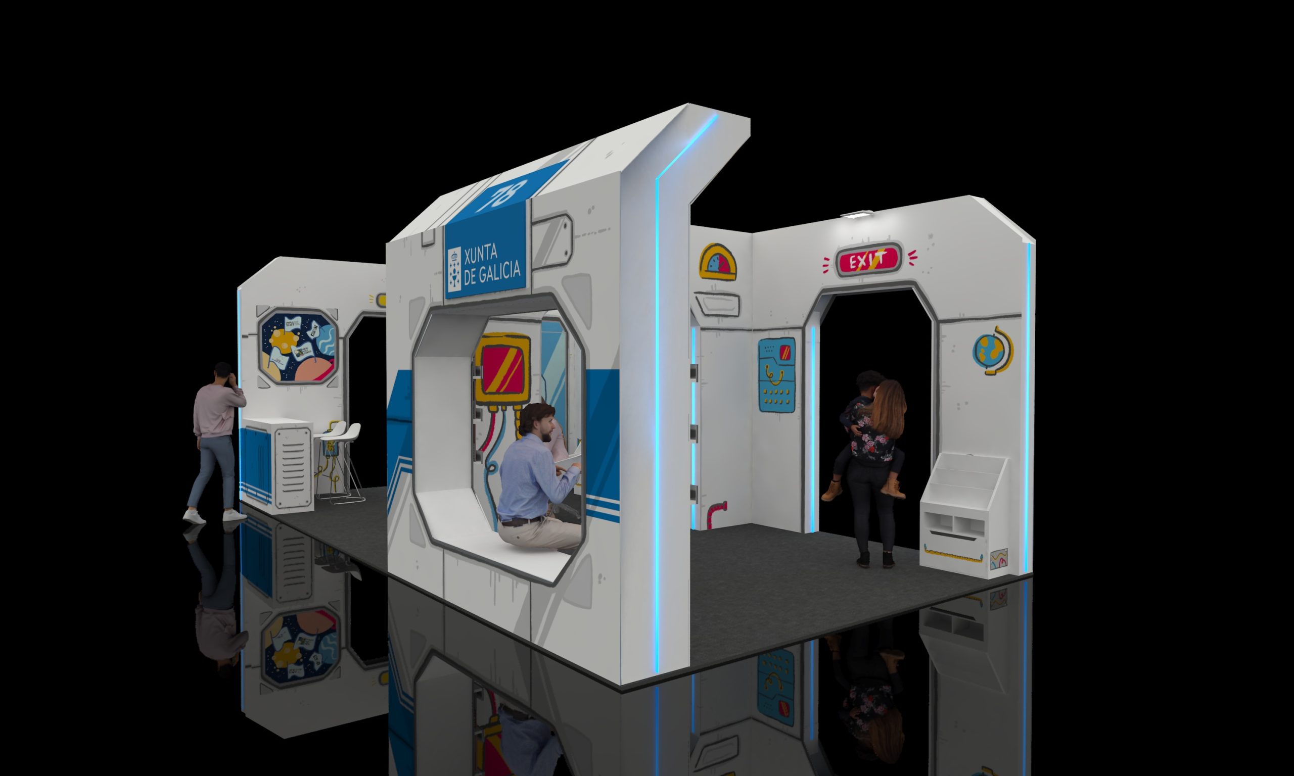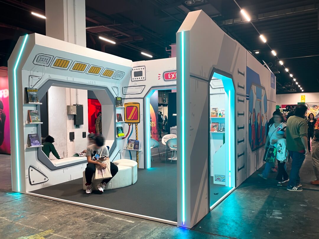 Ilustraciones para el decorado exterior e interior del stand oficial de la Xunta de Galicia en el Cómic Barcelona 2025, simulando una nave espacial.
